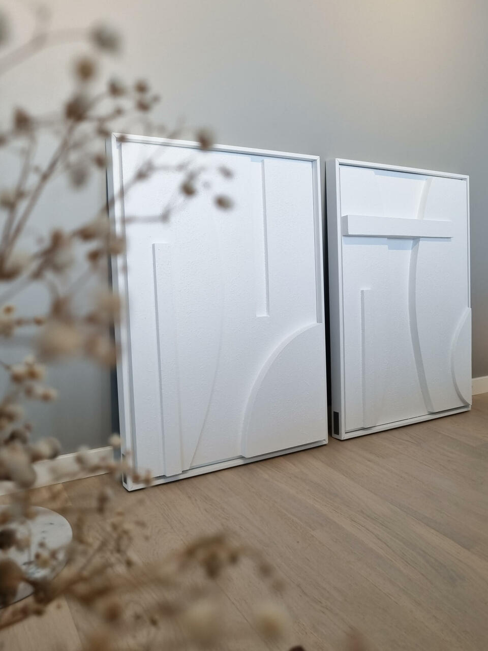 Kaksikud Albera'd toimivad ruumis imeliselt nii üheskoos kui ka eraldi. Raamitud valge struktuurliivaga teos on ajatu klassik, mille sobivuses erinevatesse interjööridesse saame enam kui kindlad olla. Puhta valge tooni juures ei ole ka karta, et silm sellel puhkamisest kuidagi tüdineks. Vastupidi, iga erinevalt langev valgusvihk näitab teost jälle uuest küljest jättes avastamisrõõmu kauemaks.